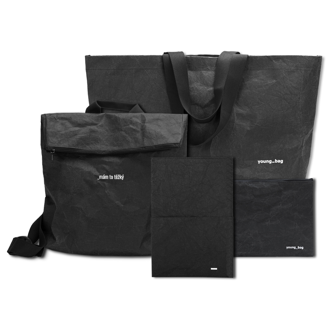 blok v obalu s kapsou, velká taška, velký batoh a kapsa na zip v černé barvě